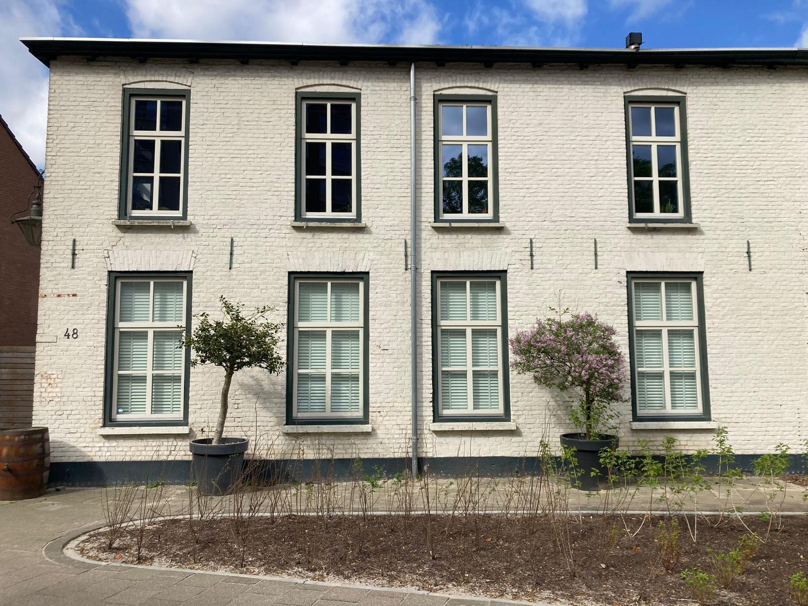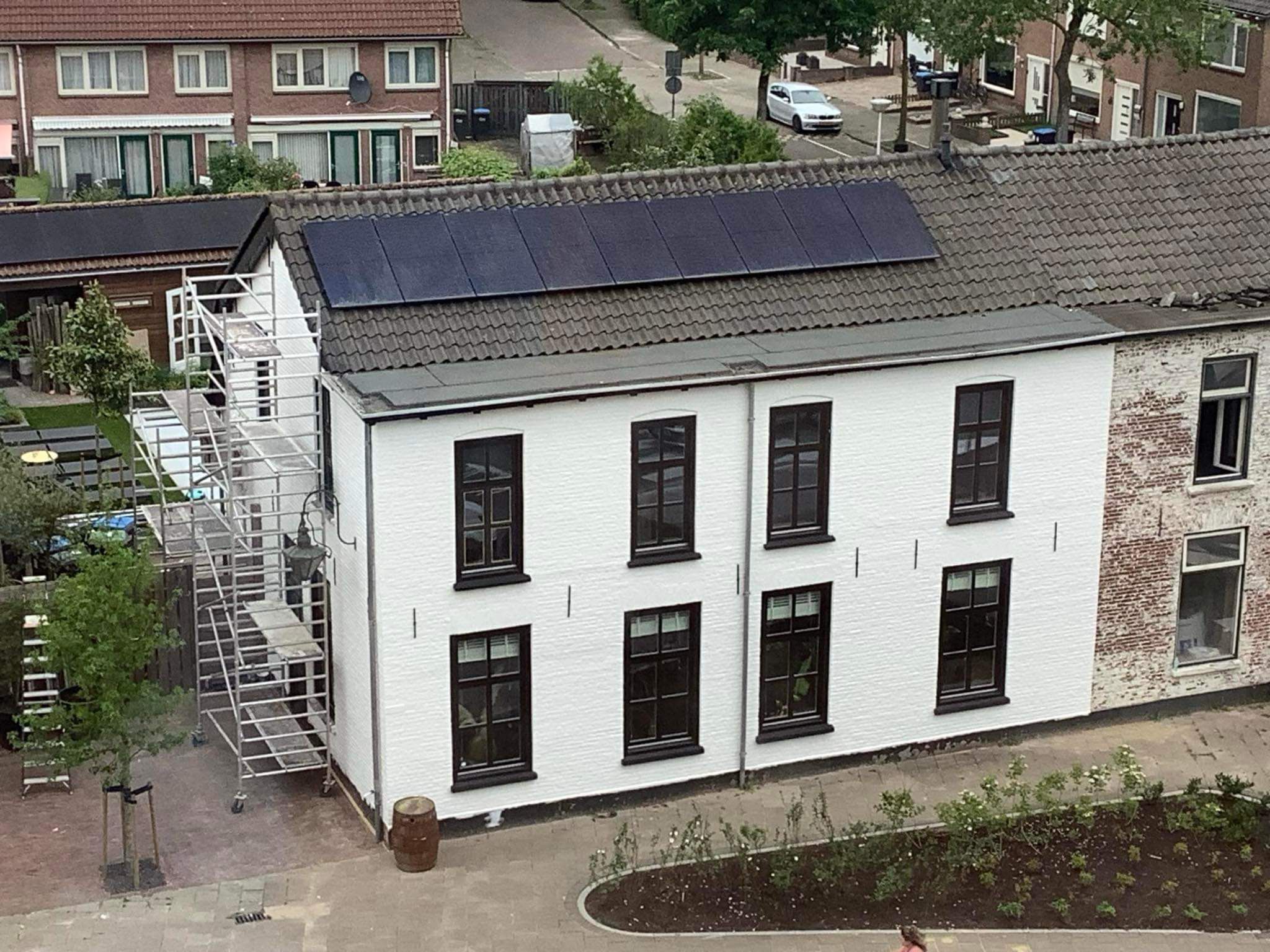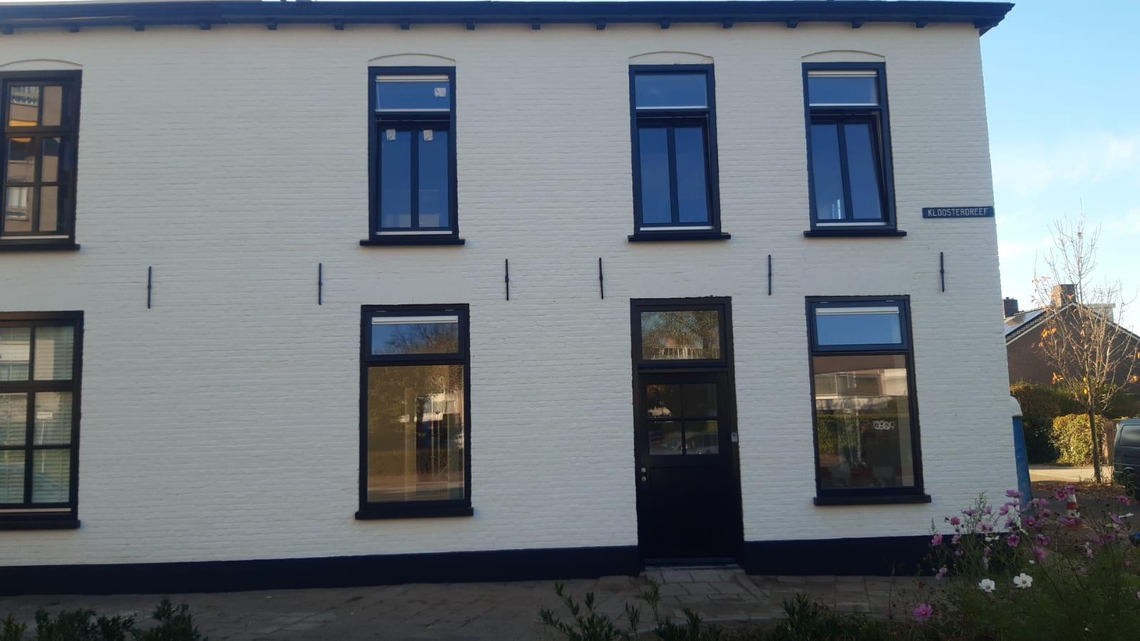 De kozijnen zijn opnieuw gegrond en afgelakt met zwarte verf, wat de woning een moderne, krachtige uitstraling geeft.